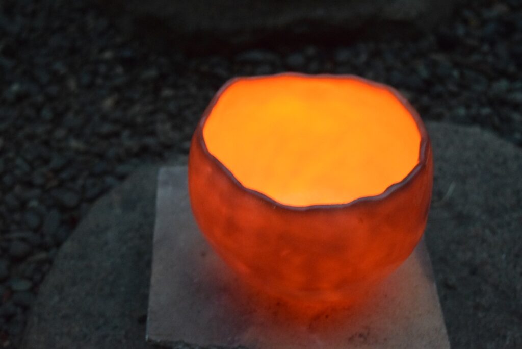 ・轆轤を使わず手びねりで茶碗を成形します。粘土をこねながら、ゆっくりと台の上で伸ばしていきます。アシンメトリーで手のぬくもりが伝わる一点物の茶碗が特徴です。