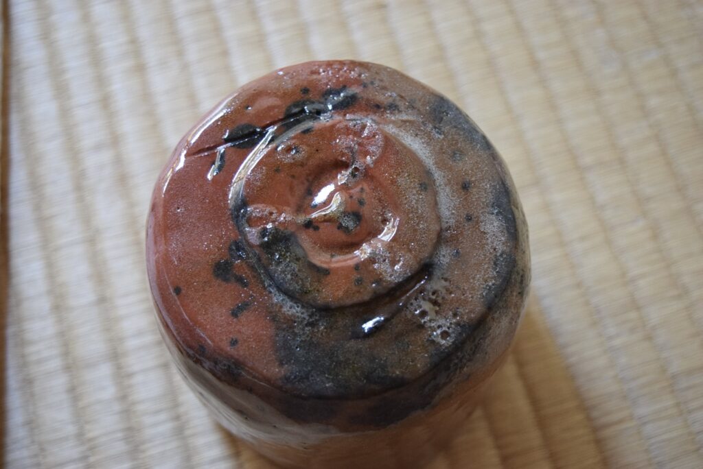 正面に薄く入ったヒビと黒の窯変が特徴的な茶碗。狙いどおりです。